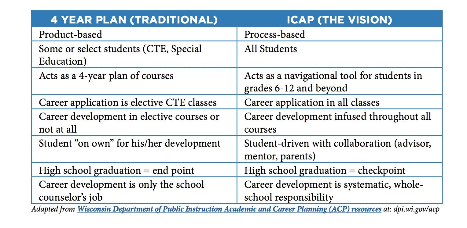 “Districts must make a shift in thinking, approaching and delivering career development in their schools in order to help students and their families become more informed consumers of the education and training required to meet their personal goals. The shift is a strategic one, toward a holistic and student-centered approach and away from the random acts of career development characteristic of the past. Strong infrastructure, relationships and student awareness are key to successful implementation of ICAP.”